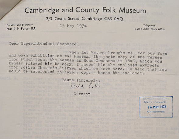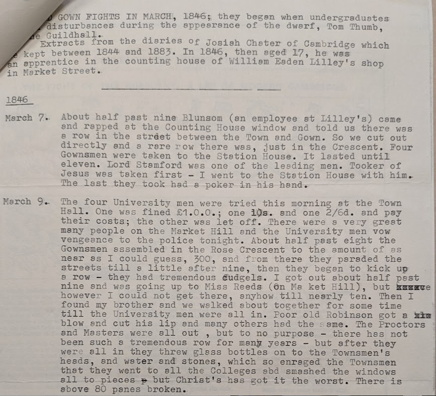Town vs Gown fight in 1846. Extract from the diaries of Josiah Chater March 7 & 9 1846.