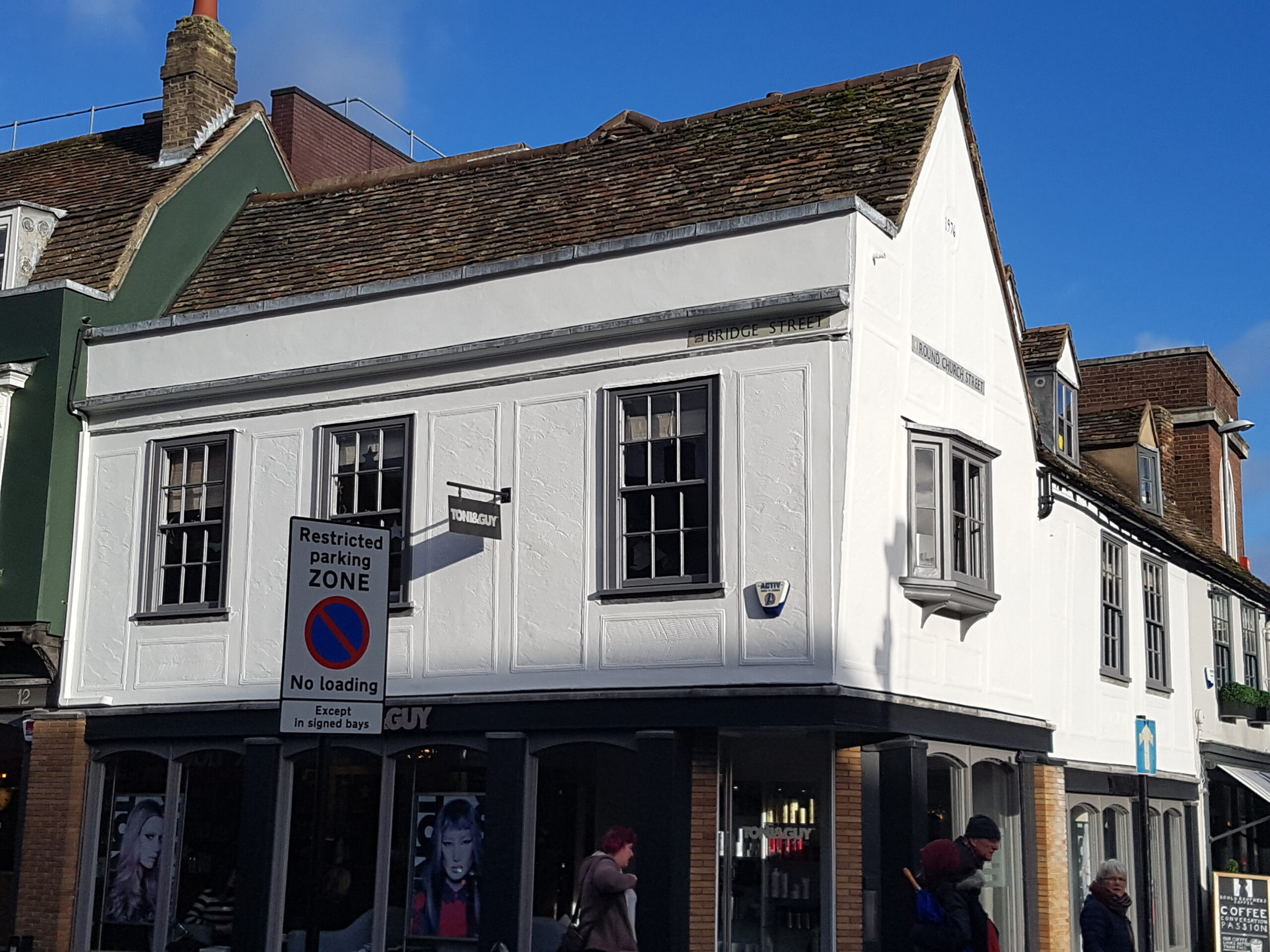 10 Bridge Street, Cambridge1959 Royal Commission on Historical Monuments Survey of Cambridge: Nos. 10 and 11, and No. 16 Round Church Street, and stand on the corner NW of the church of the Holy Sepulchre. No. 11 is of one build with No. 12 but now united internally with No.1o, which itself is one build with No. 16 Round Church Street. The last two were built in the 17th cent.; the walls are of plastered timber-framing. … On the first floor of No.10 mucho pf the main room is lined with 17th cent. panelling … loose in the attic is a 16th cent. bargeboard carved with leaf and vine ornaments.