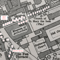 13 & 14 Little St Mary's Lane CambridgeRoyal Commission Survey of Cambridge 1959: probably of the same build [ as no.12]. It was separated into two tenements and a chimney stack inserted in the N wall of the W tenement in the 18th century or later; the stack contains older reused brick.