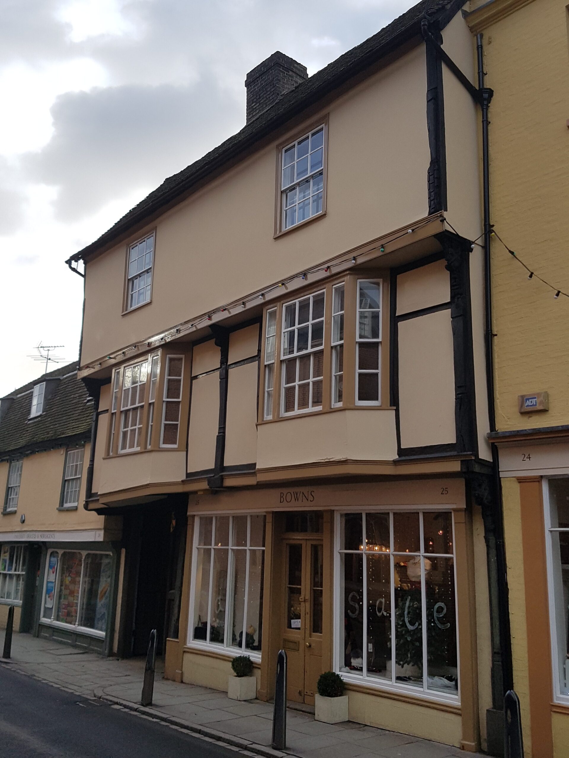 1959 Royal Commission on Historical Monuments Survey of Cambridge: once the Cross Keys Inn, of three storeys to the street and two storeys with cellars westward, has plastered timber-framed walls and tiled roofs. It is L-shaped on plan. The long W range is of the early 16th cent., the street range of the early 17th cent….Nos 25 and 25a comprise a notable time-framed town house of the early 17th cent. with a late mediaeval rear wing; the street front though simpler than that of no.14 Trinity Street is much less restored… the panelling from the N first floor room in the street range is now in the Small Combination Room at Magdalene College.