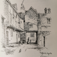 Then and Now (David Gent) – ‘A Little Bit Of Old Cambridge’, The former yard of the Cross Keys Inn, Cambridge. Now Benson Court looking out towards Magdalene Street with Magdalene College over the road. Benson Court is now used as student accommodation for Magdalene.