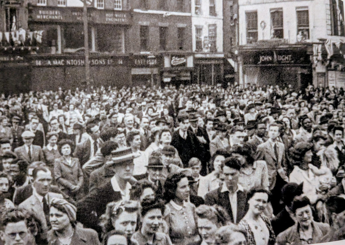 8/5/1945 VE celebrations, Market Square, crowd of several thousand, waste paper dump in St Mary’s Passage set on fire, cars and stalls damaged, flag on top fountain, climb Guildhall clock (Cam.News)