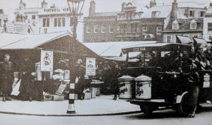 10/9/1919 Cattle market as now conducted is of no value to town … a waste of expensive shoe leather. Previously could purchase a fowl or duck ready for table at a reasonable price, the Cambridge ‘yard’ of butter, eggs, fruit, meat etc. Now a dump for where high prices are rule. Patrons are those fairly comfortable who desire freshly-produced vegetables and are prepared to pay for them at prices dearer than in shops. On Saturday was fairly brisk competition in fish, meat stalls doing food business. An open market is wanted every day on Market Hill to bring down prices and dispose of tons of produce which will otherwise go rotten. Are already hawkers of fruit and vegetables. During trade depression some traders had a hard struggle; employees now coming back but require more wages to meet the rising cost of living. Fair competition doesn’t cause anxiety but the open market is unfair. They buy wholesale, dire a stall for a negligible sum and sell at small margin of profit – debate – (Cam.News)