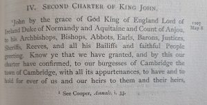 1671 Samuel Newton’s Diary 30 Sep., describes the visit of King Charles II to Cambridge. The king was met on Christ’s College piece by the aldermen. There was later a dinner at the Town Hall at which were most of the knights and gentlemen of the county.