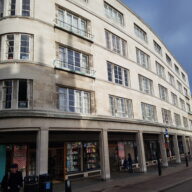 Radcliffe Court, 1964, was built by Stanley R Nevell & Partners with a frontage designed by the City Architect’s department. Mixed use, ‘the maisonettes above the first floor set askew like sawteeth.’ (Pevsner)