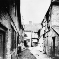 Petty Cury south side, 1867 (from left, Wrestlers Inn, Holdsworth, Pont, Copping, Red Hart Yard, Falcon Yard and Red Lion) (Cambridgeshire Collection)