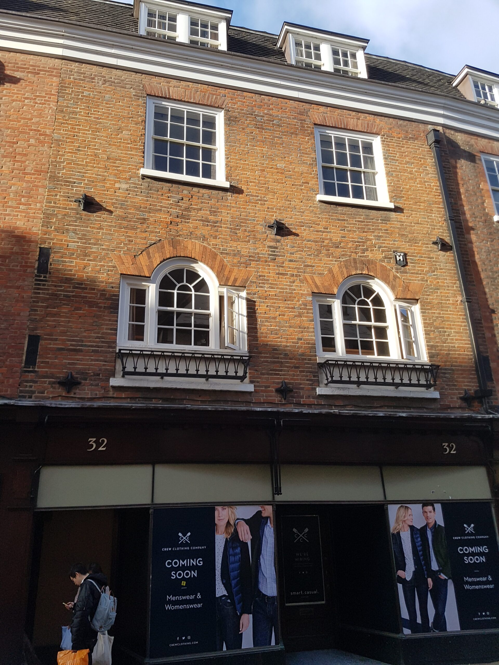 No. 32 is a mid C18 red brick house with Venetian windows on the first floor. It was extended W early in the 19th cent. John Bowtell, bookbinder and antiquary, lived here. Inside there are original cornices, panelled doors and a staircase. There is a good early 19th century staircase in a well lit through a roof lantern. (see 1959 Royal Commission on Historical Monuments Survey of Cambridge)