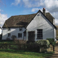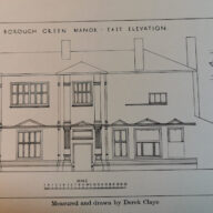 A large early C19 gault brick house with a low parapet and a plain stone band, three storeys.