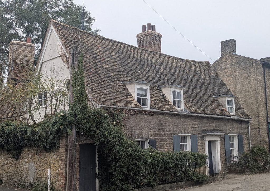 Two cottages, now one, forming an L-plan. The front range was an open-hall, C16, into which the floor and hearth were inserted in C17. In c.1840 the facade was cased in gault brick. (Historic England)