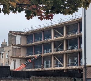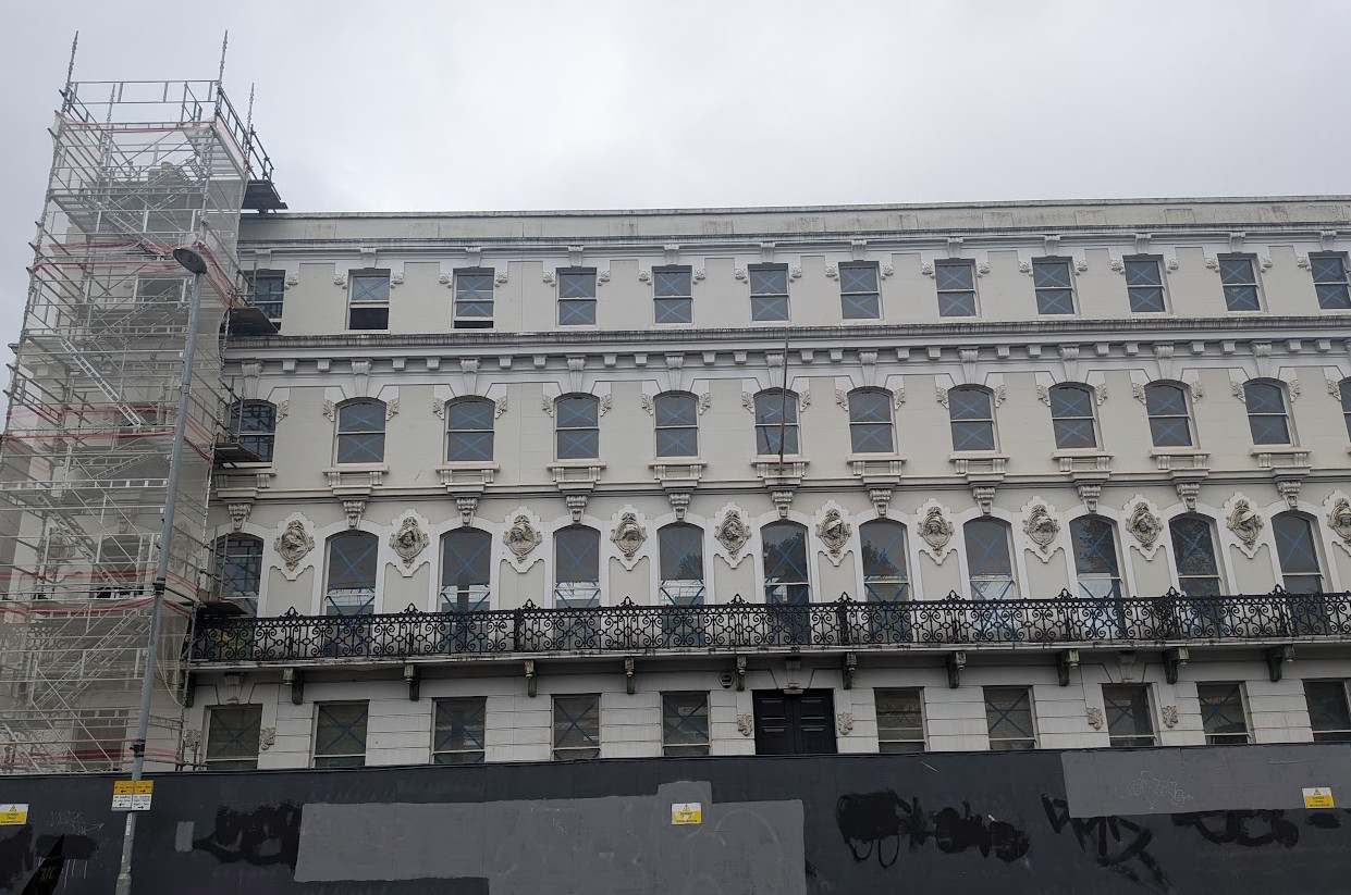 Pevsner notes (Cambridgeshire p. 327): the retained facade of Cintra House, originally added c 1860-5 to an early C19 four-storey terrace. The design is reportedly by John Edlin, in a very coarse eclectic style, with a row of roundels and heads sticking out of them.