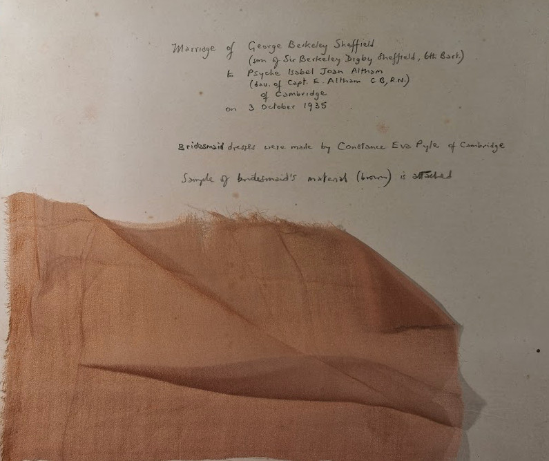 Marriage of George Berkeley Sheffield (son of Sir Berkeley Digby Sheffield, 6th Bart.) to Psyche Isabel Joan Altham (daughter of Captain E Altham C.B., R.N.) of Cambridge on 3rd October 1935. Bridesmaid dresses were made by Constance Eva Pyle of Cambridge. Sample of material (brown) attached.
