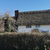 C17 timber framed and plastered farmhouse with later extension to east. (Historic England)