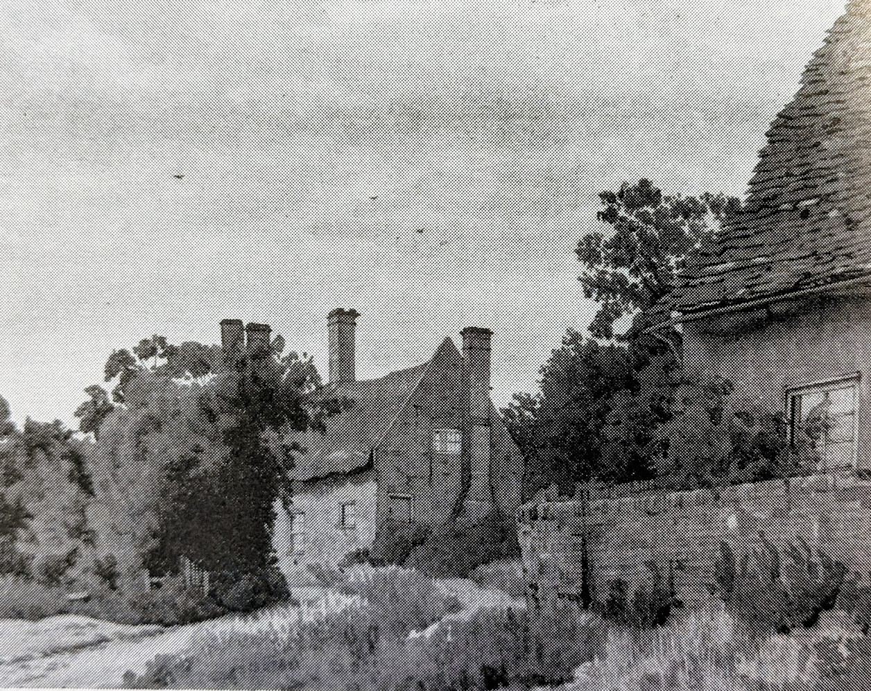 Farmhouse dated 1623 in plastered panel on left hand stack. T-plan, two-storeys with single-storey range to left hand.