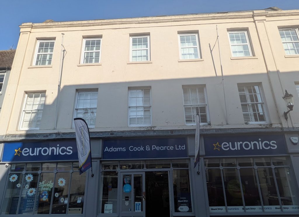 Circa 1800. Cement faced. 3 storeys, 5 windows, sashes with glazing bars over modern shopfront, further blind bay to right.