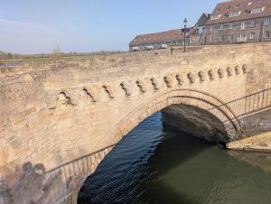 Circa 1300 but repaired over the centuries. Of stone throughout, with 6 pointed arches with cutwaters and refuges on both sides. There is a band of trefoil decoration in the form of corbelling over 2 arches these are probably the most ancient part of the bridge. A fine and famous example of a medieval bridge. The 3rd arch was replaced by a drawbridge during the Civil War.