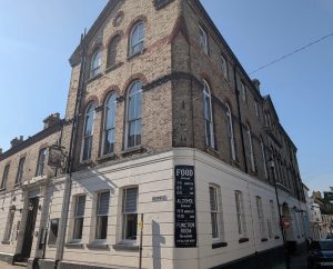 1865. By R. Hutchinson. Gault brick, rendered and grooved on ground floor, red brick dressings above. 3 storeys,