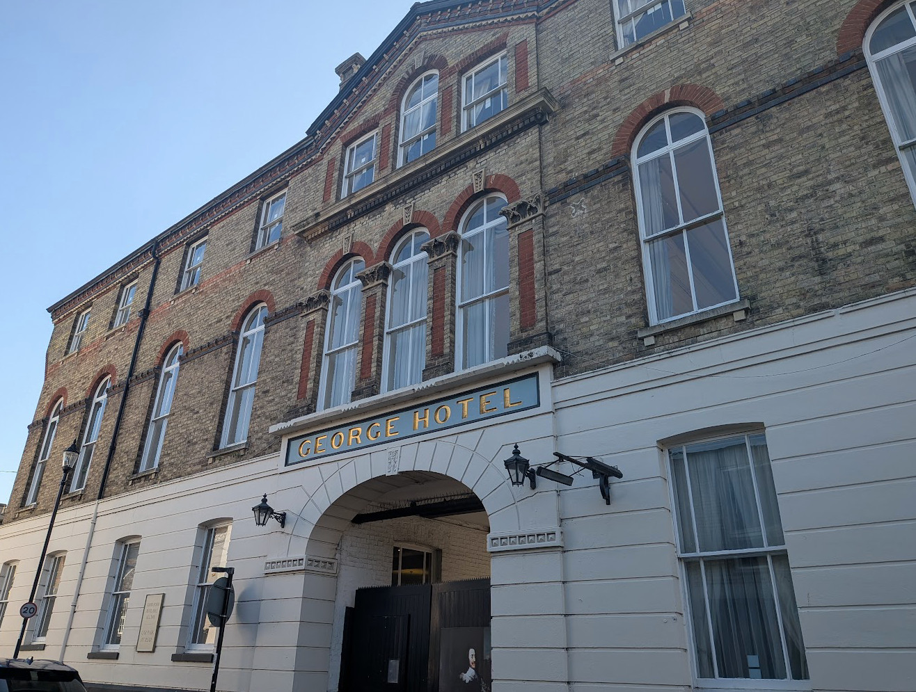The George Hotel, and 102 High Street (on right) Huntingdon c1905Listed Building