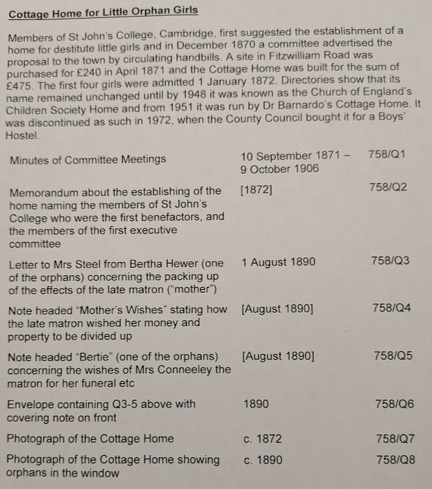 The first four girls were admitted on 1 January 1872. Spalding’s and Kelly’s Cambridge Street Directories describe it as the Cottage Home until 1948, when until 1951 it is attributed to the Church of England Children’s Society, thereafter as Dr Barnado’s Cottage Home. Cambridgeshire and Isle of Ely County Council purchased it for a boys’ hostel in 1972)