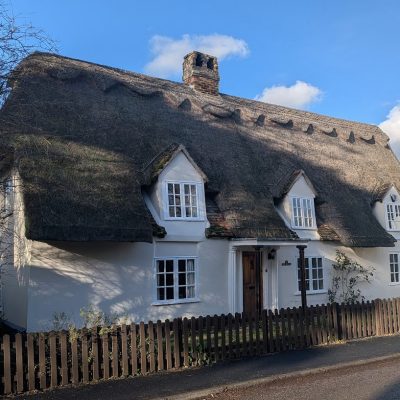 Cottage. Late C17. Timber framed, plaster rendered and reed thatch roof with red brick ridge stack.