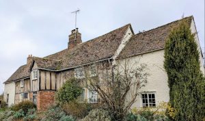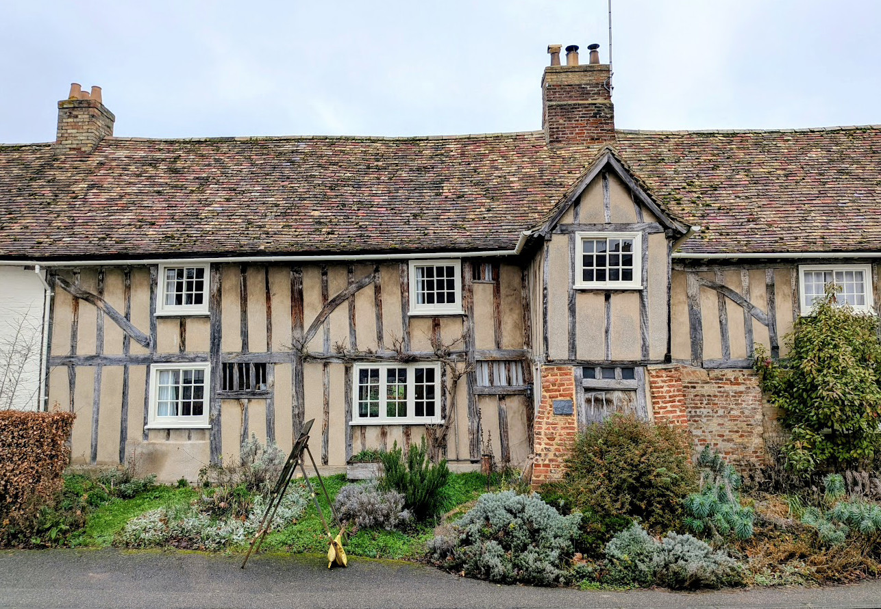 House, now two dwellings. Mid C16, extended by one bay early C19, and again probably later in C19. Timber-framed, red brick, gault brick, painted, and clay bat, roughcast rendered.