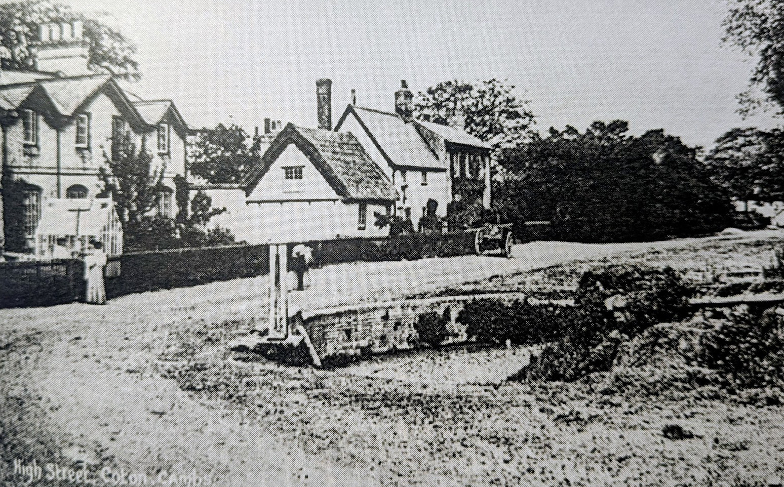 High Street, Coton (Cambs Collection)Wall of pond visible in foreground next to churchyard wall. The smithy is to the right.