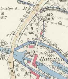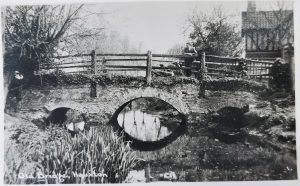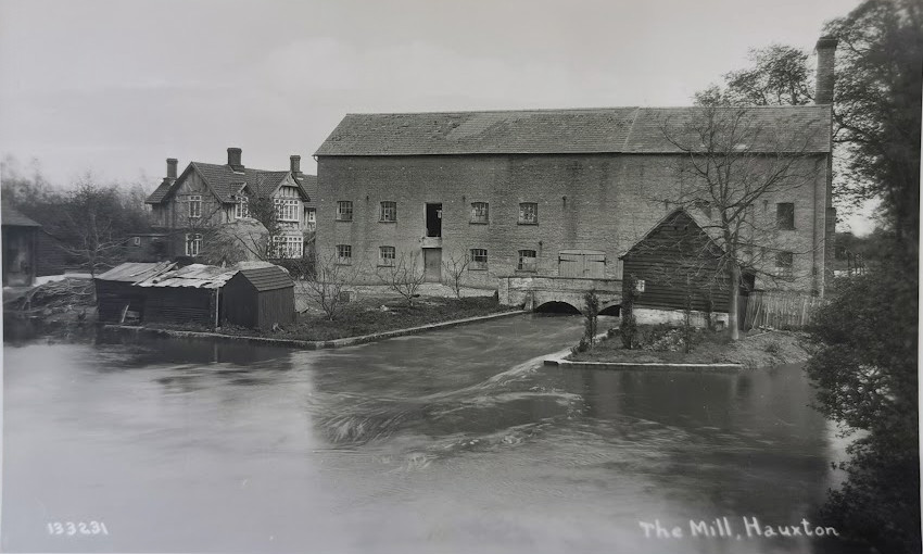 The position of a building suggests that the old bridge is the one adjacent to the mill, rather than that on the A10.