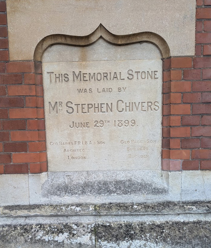 Foundation stone at base, inscribed, ‘This memorial stone was laid by Mr Stephen Chivers June 29th 1899.’