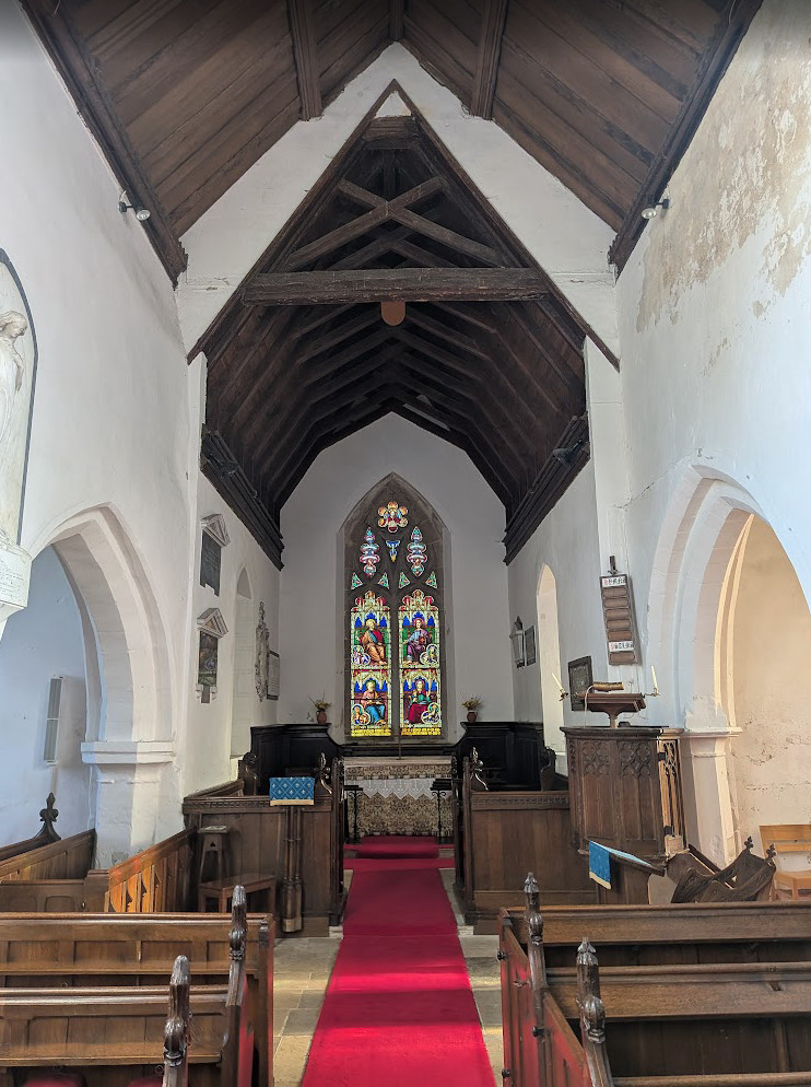 13th cent: the short nave is the oldest part of the church to which chapels were added.In the south chapel there is a piscina and a lancet window.