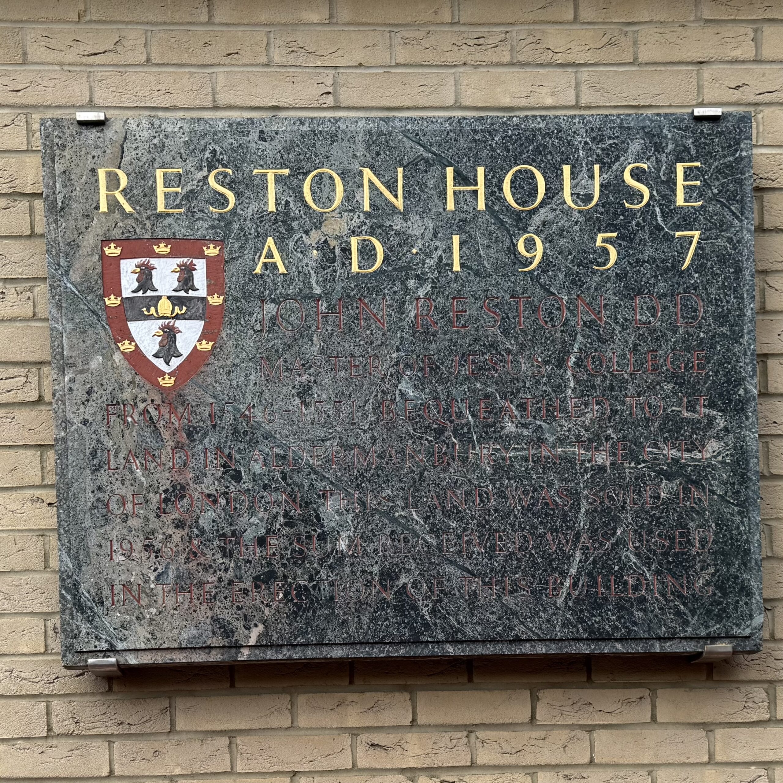 The row was named Reston House after Dr John Reston, master of Jesus College in the 16th Century. A plaque detailed how this came about and reads: