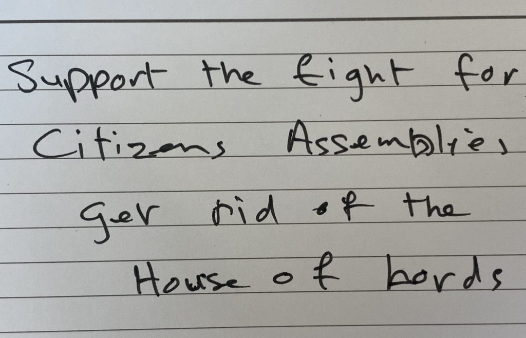 ‘Democracy Beyond Elections’ mostly delved into the efficacy, inspiration and challenges of citizens’ assemblies, exploring different examples and outcomes. Much of the content was generously given over to questions and comments from the attendees.